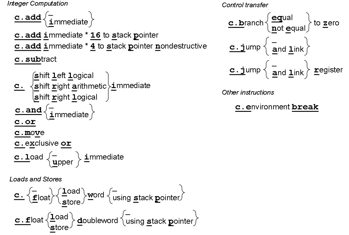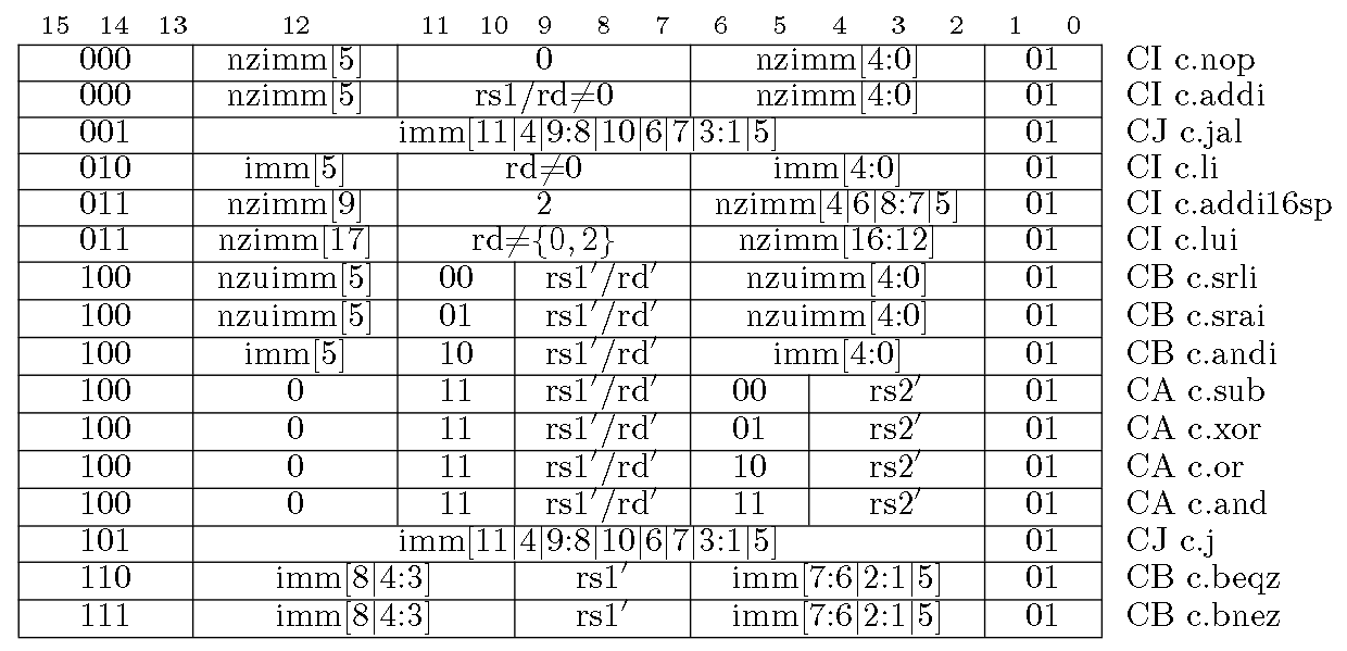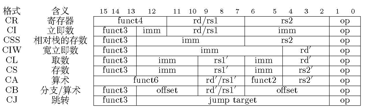 注:对于立即数字段,移位指令和c.addi4spn采用零扩展,其他采用符号扩展;rd’, rs1’, rs2’表示10个常用寄存器a0-a5, s0-s1, sp, ra;